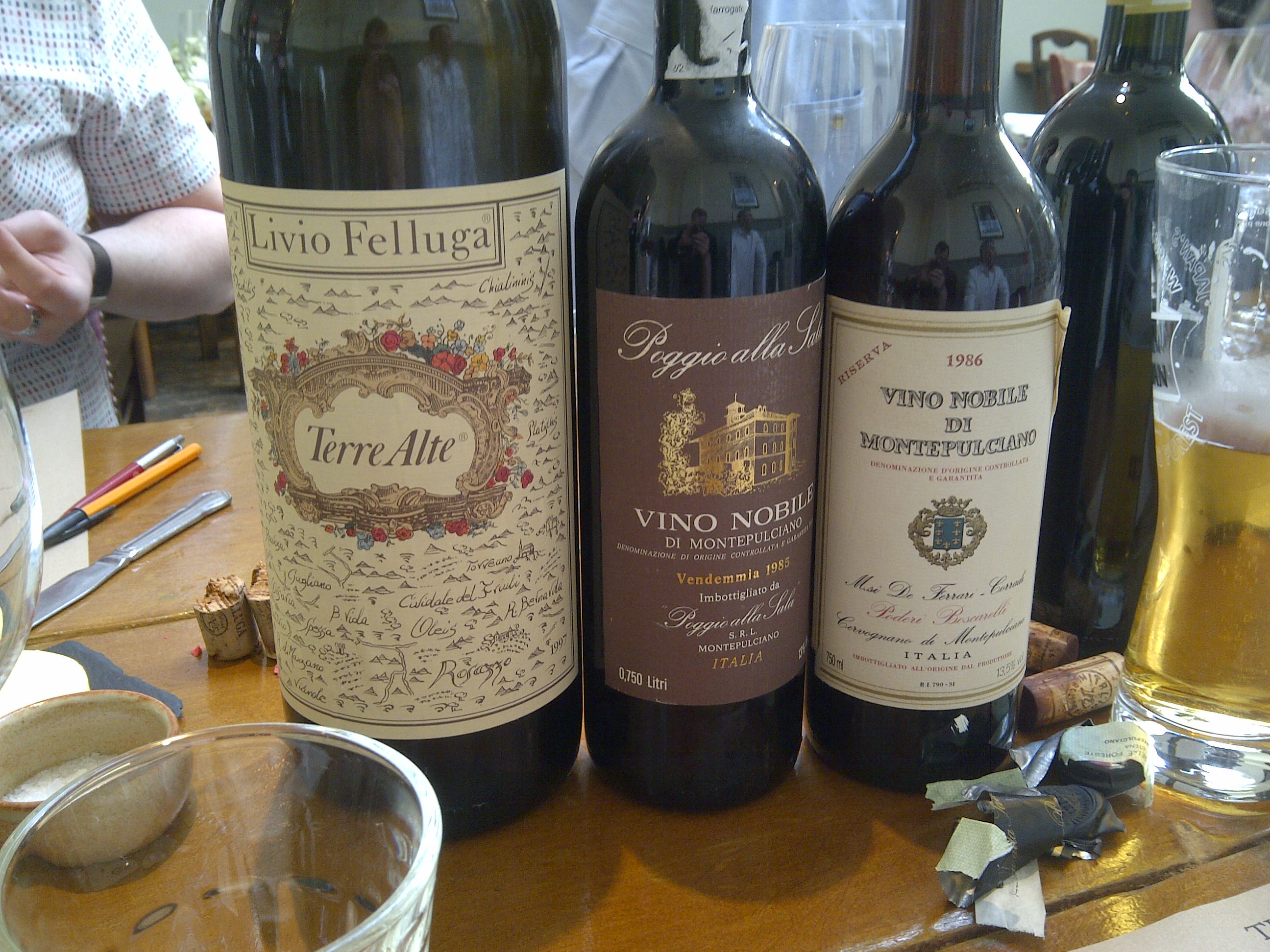 One of my two Wines of the Day was not a Vino Nobile, nor was it red. It was Livio Felluga Friuli Rosazzo Bianco “Terre Alte” of uncertain vintage (front label said 1997, back label 1996, probably therefore the former). Generously provided in magnum, it had hints of a dry Sauternes, waxy and with a citrus orange not quite reaching marmalade. It grew in complexity. I’d never had one this old, and I’d love to do so again, although doubtless the bottle size had its effect.