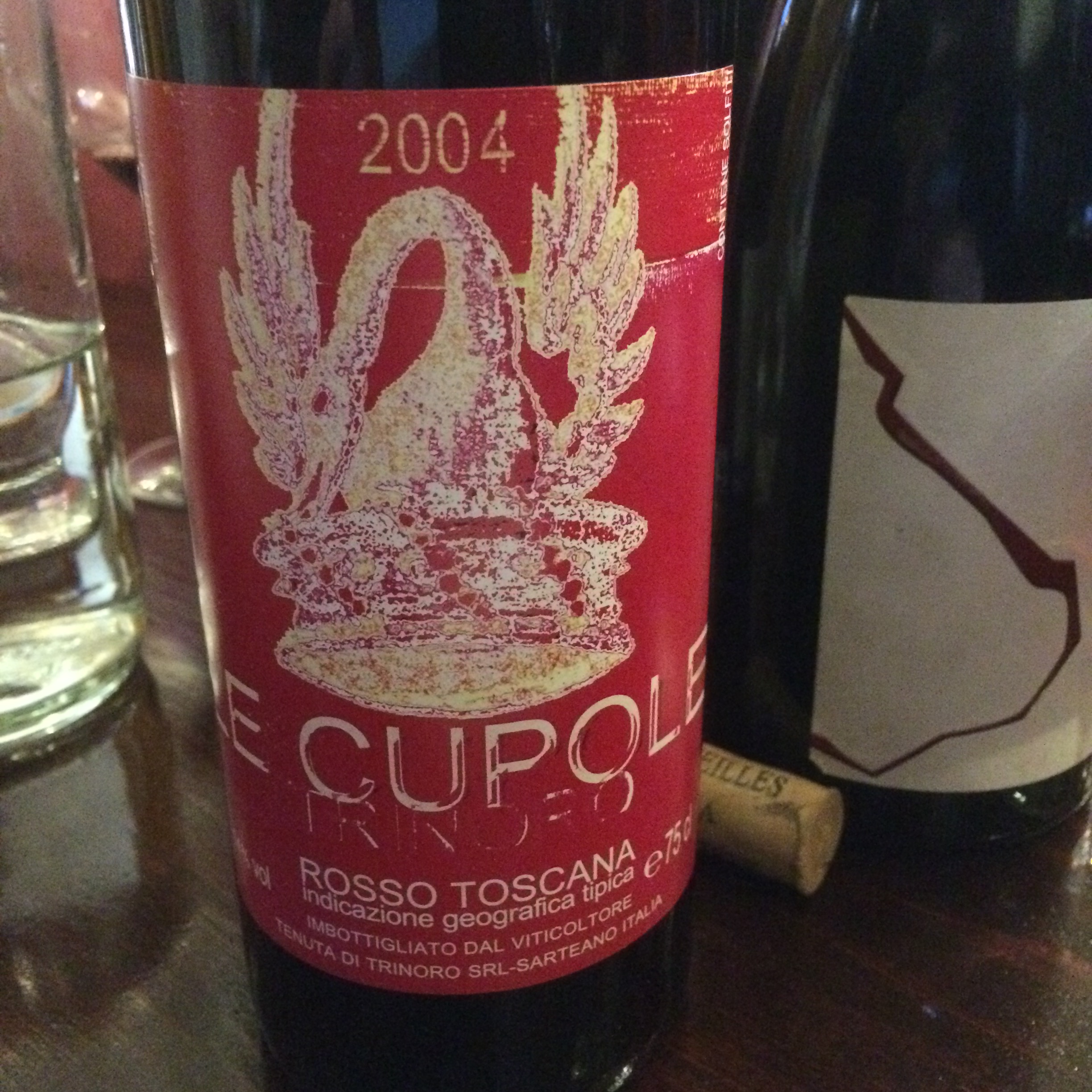 Rosso Toscana “Le Cupole” 2004, Trinoro – Another 2004, this time the Cabernet Franc based wine from Tenuta di Trinoro, based in Southern Tuscany’s Val d’Orcia. I’m not sure of the exact grape mix of the 2004, but usually it’s around 50% Cabernet Franc, plus or minus a few percent, with added Merlot at around 30%, the rest made up of varying quantities of Cabernet Sauvignon, Petit Verdot, and even Cesanese and Uva di Troia. So a real Super Tuscan. Quite brambley, though I might well not have identified this as a Tuscan wine blind. Quite resolved now, I’d say.