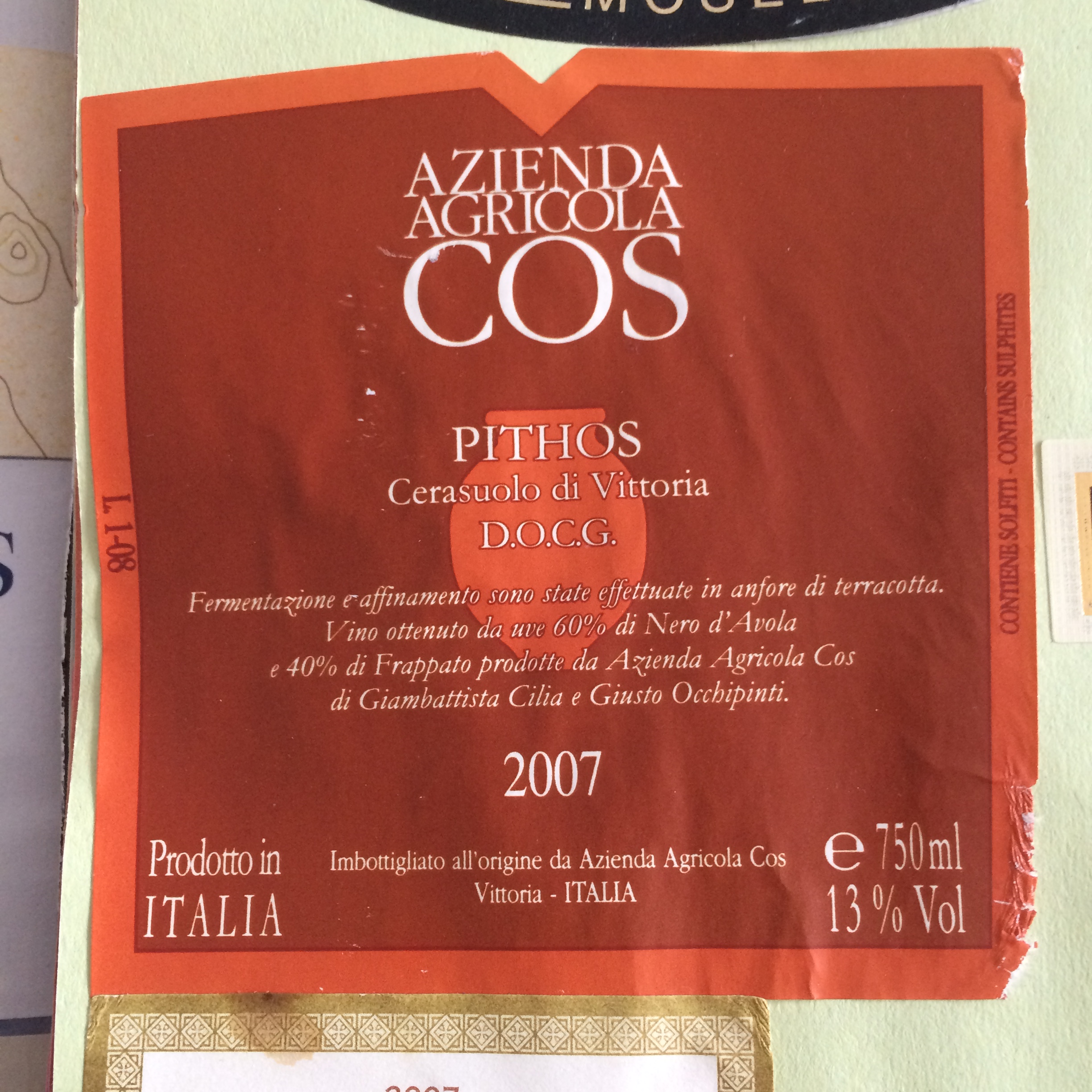 COS produce a range of wines now. The wine they rejuvenated is Cerasuolo di Vittoria, now Sicily’s first DOCG wine. It’s made from Nero d’Avola blended with a lovely local grape, Frappato. The wine which made them famous perhaps, is Pithos. It’s a Cerasuolo fermented in terracotta giare, or amphora. It has amazing texture and is a fickle wine capable of true sublimity. But COS also bottle a varietal Frappato, among others. It’s bright and pale in colour with light strawberry fruit, and has become the COS wine I look forward most to drinking. In some ways simple, yet in other ways, not.