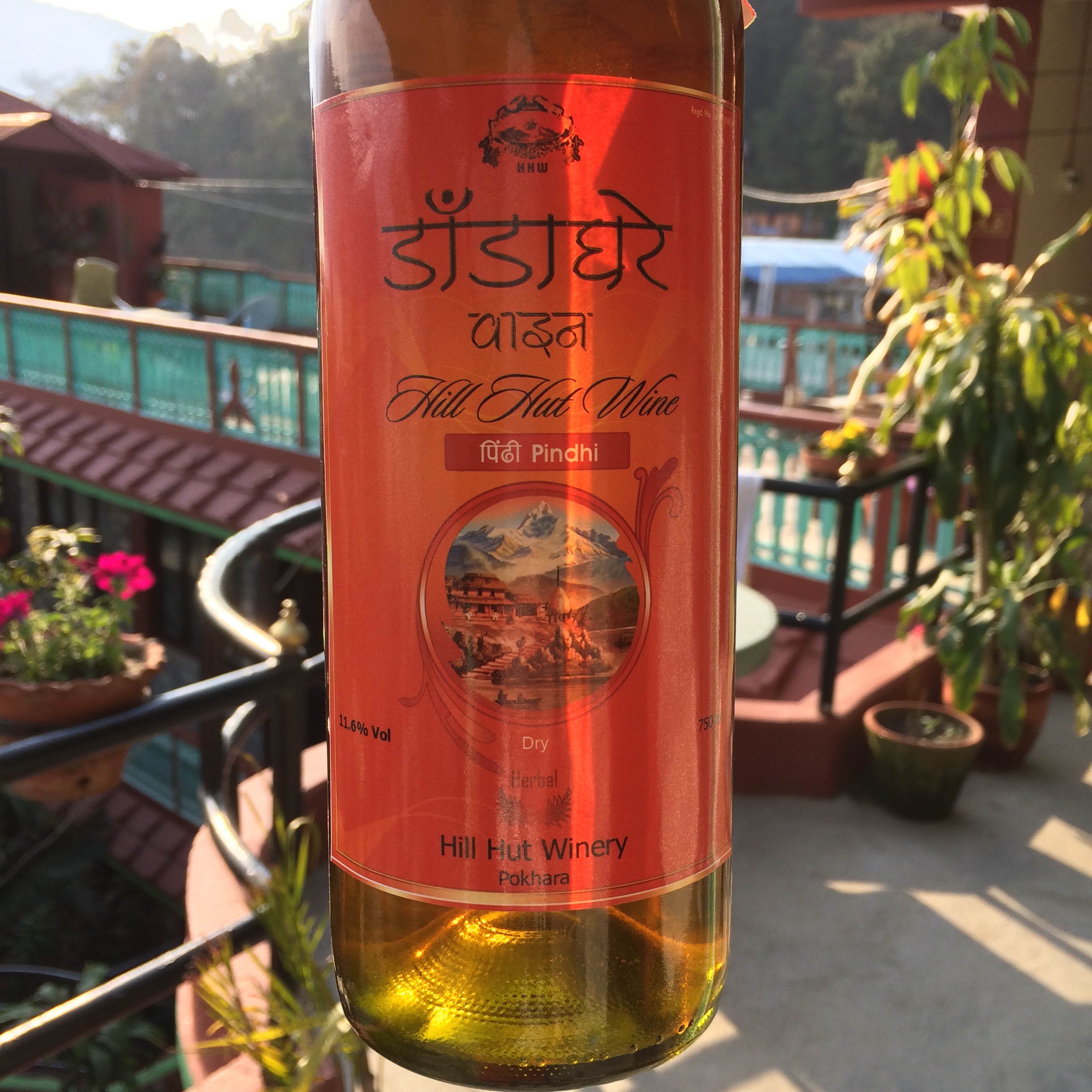 We spent a week on the lakeside at Pokhara, about a seven hour drive west, down the fertile Kathmandu Valley. It’s an idyllic place, a large lake surrounded by hills and, in the morning light, magnificent views of the Annapurnas and Machhapuchhare (“Mount Fishtail”). It was in what is probably Pokhara’s most expensive supermarket that we found Hill Hut Winery’s “Dandaghare Pindhi Herbal Dry”. They described it as a sweet red, made from “fruits, roots, herbs and honey”. To be more accurate, the colour was mid-tawny, not red, but it was reasonably drinkable. Imagine a Palomino table wine (not remotely like anything Equipo Navazos would make, I should say, though I am thinking unfortified Sherry) to which has been added a good large tablespoon of honey. Although it’s hard to be totally objective in such a beautiful location, you’d finish the bottle, though perhaps not dash out to buy more. They managed 11.6% alcohol. I will say, this was significantly nicer than any other fruit wine we’ve had in Nepal.