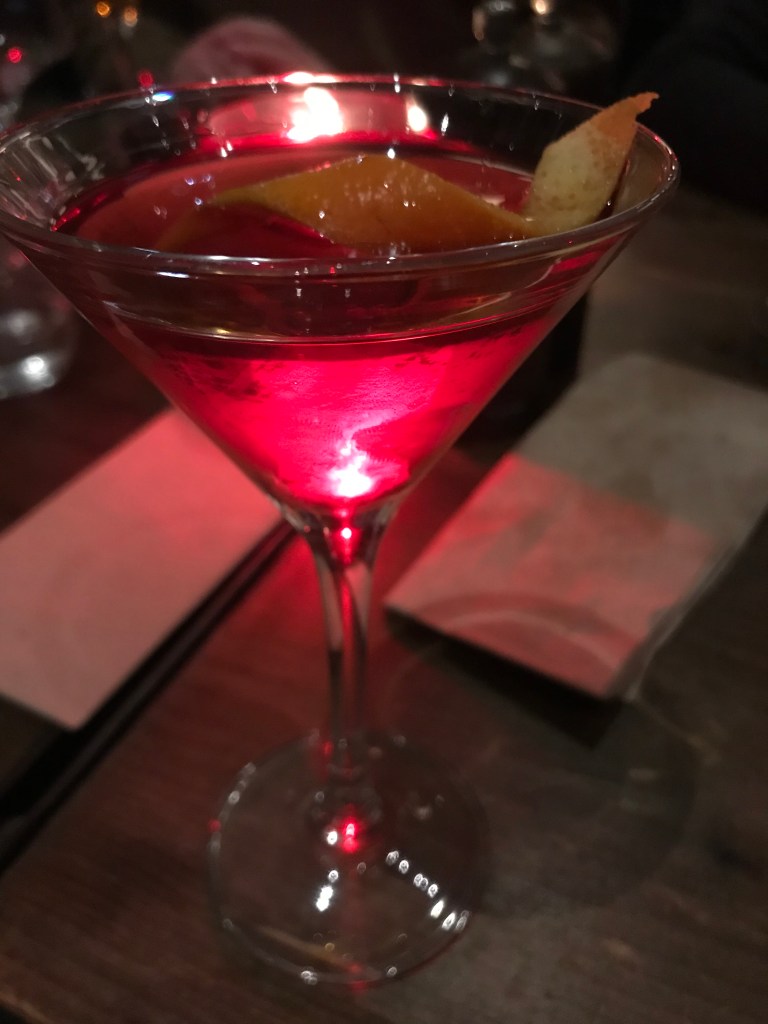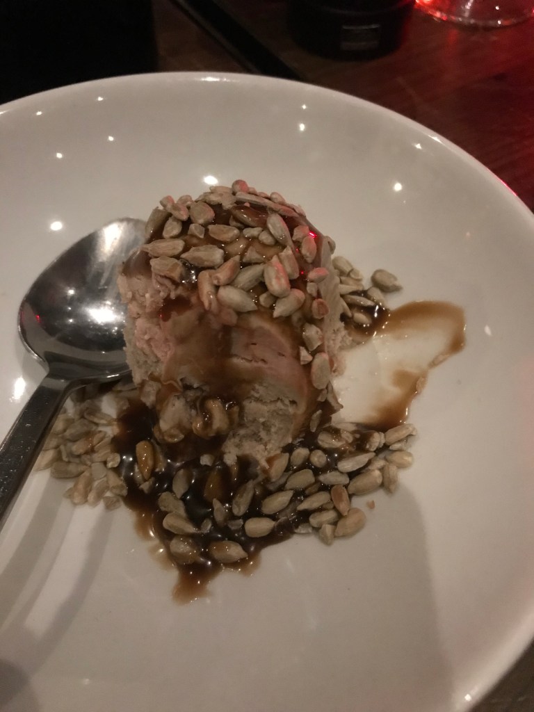 Our main courses ranged from bavette steak, bream and chicken to the most amazing cauliflower dish with toasted hazelnuts, hazelnut purée and kale. Most of us went for a cocktail for dessert, cocktails being something of a speciality at Plateau. My Bridgetown comprised Doorly’s 5-y-o rum, antica formula, yellow chartreuse and angostura bitters, quite boozy but pretty delicious. My heart (and soul) said order a second but my head said no! Those of us who went for sesame seed ice cream (non-dairy, as it happens) with a salted caramel sauce didn’t regret it. Cold ice cream and unctuous alcohol is rarely a poor match.