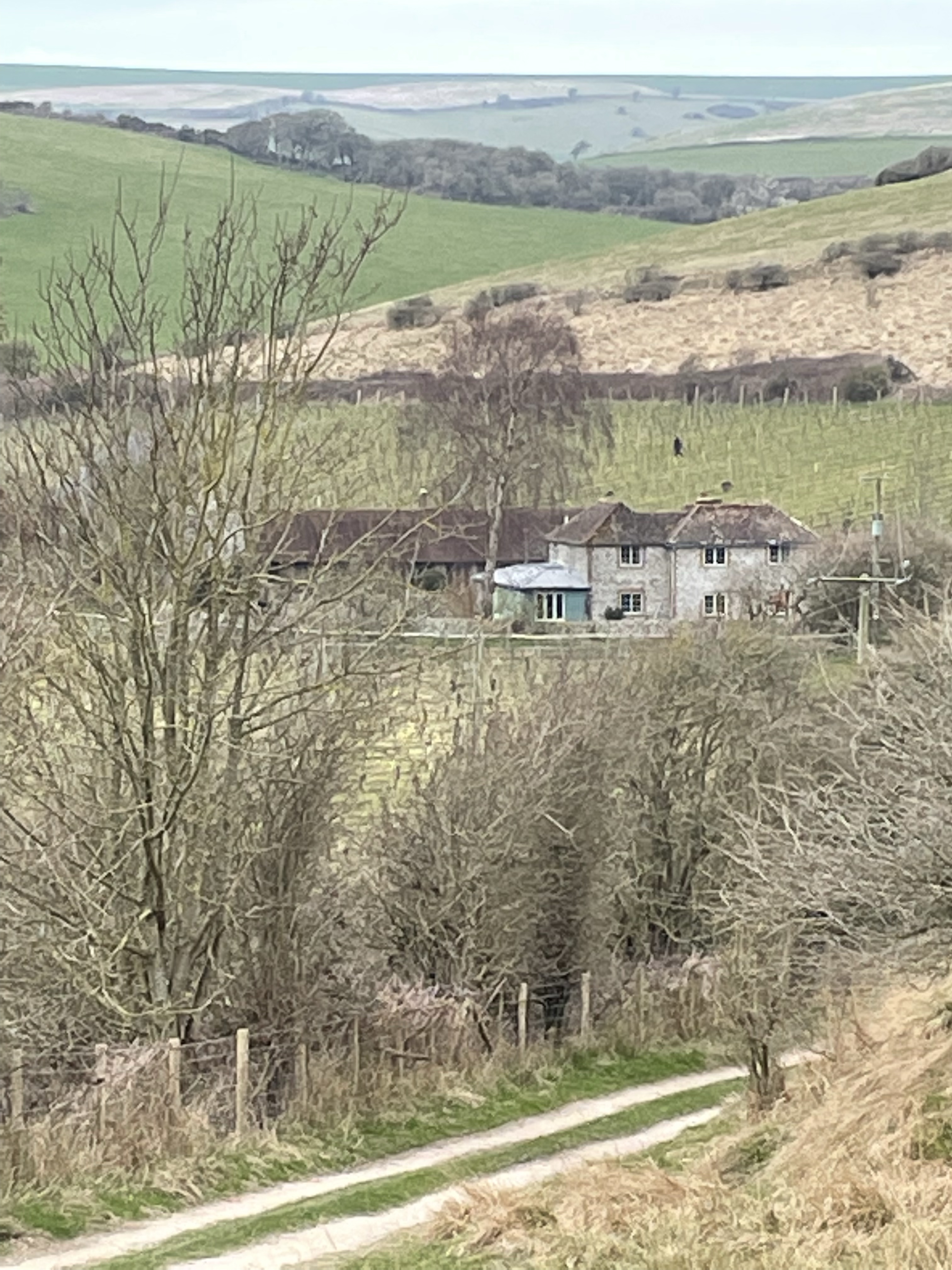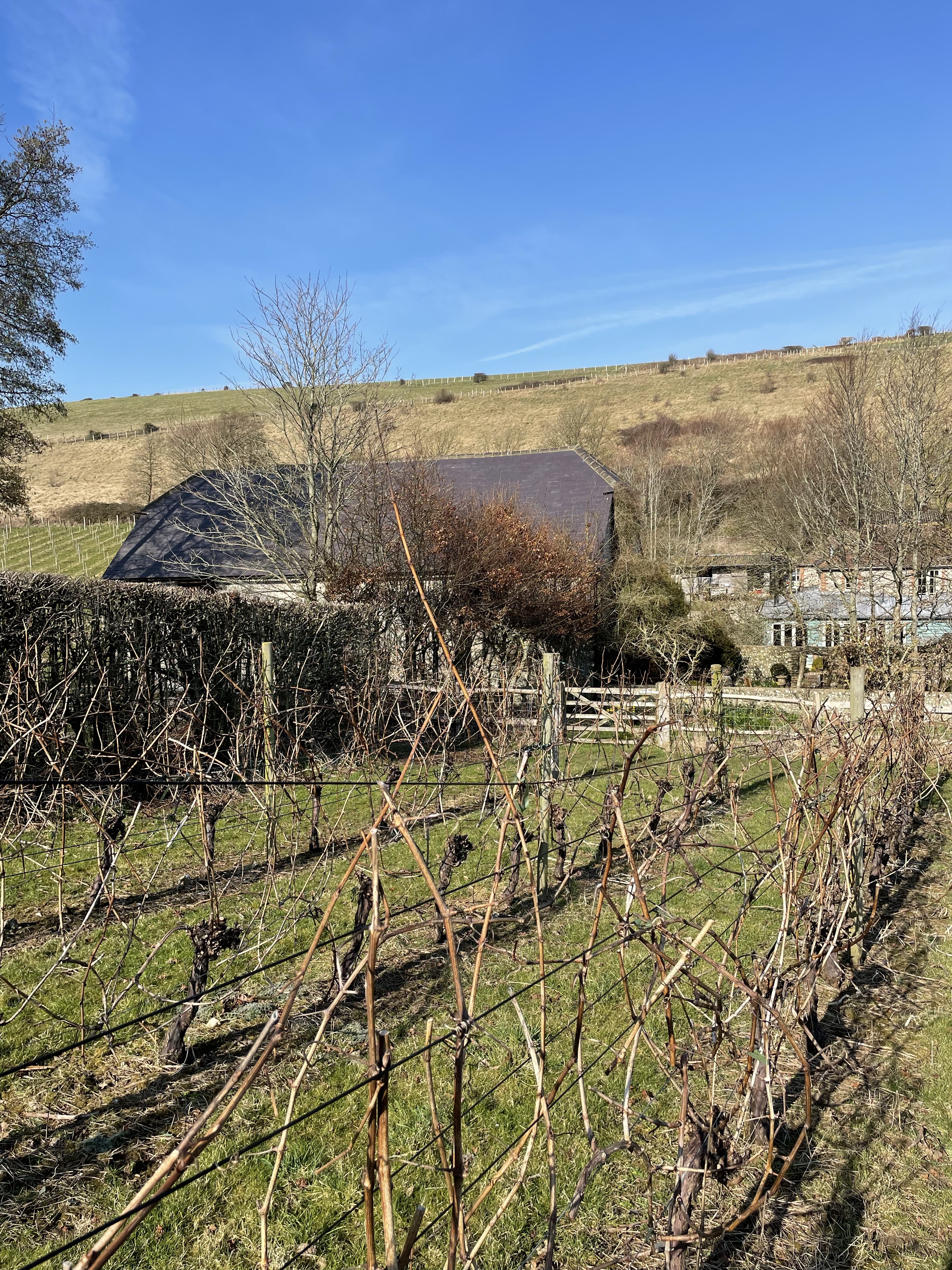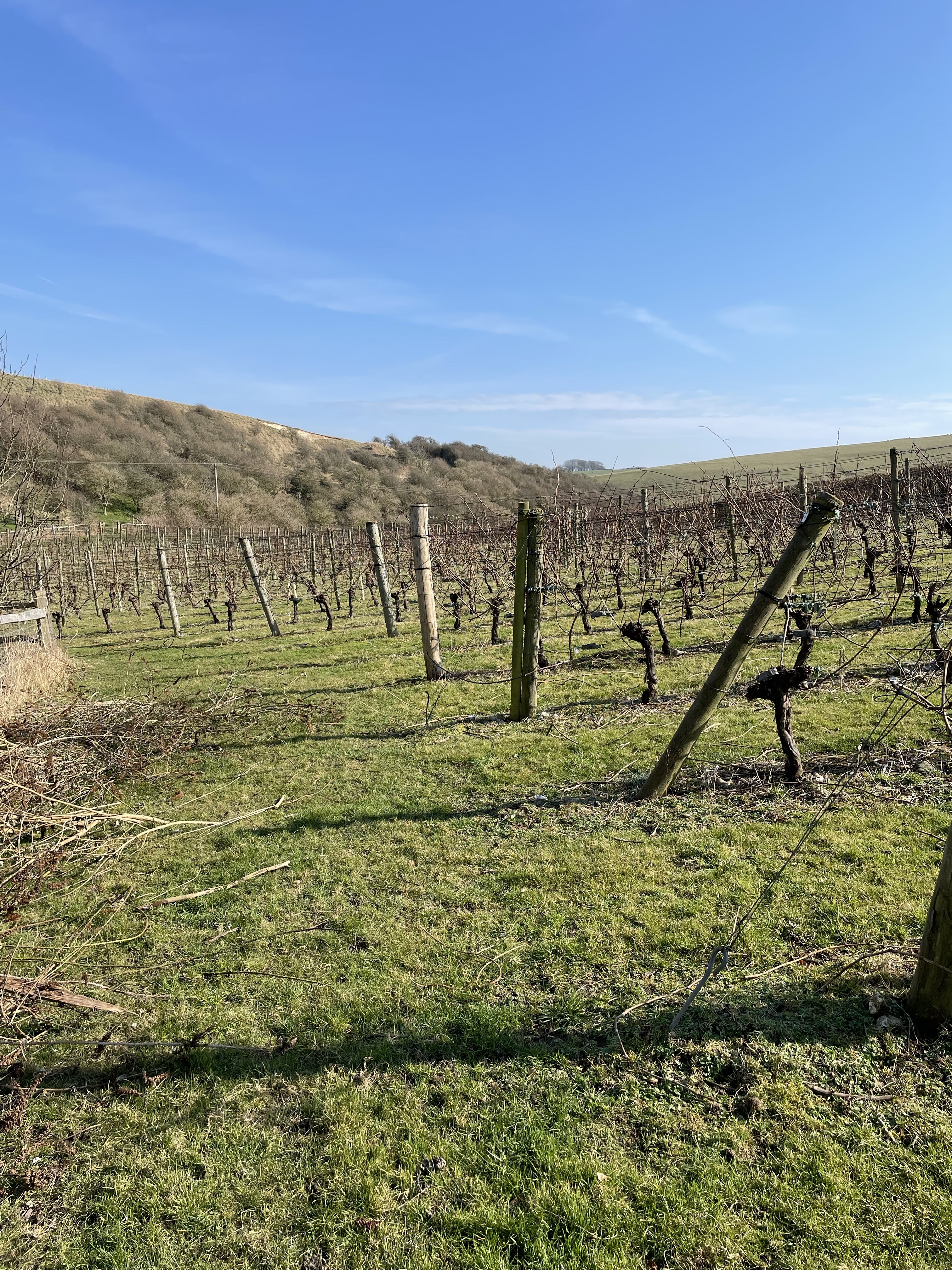 The soil is classic Downland chalk strewn with flints. One slope in the hollow faces vaguely north, the other vaguely south. Counter-intuitively, the north-facing slope often ripens first, largely because of a protective virtual cliff opposite, which carries the public footpath from the South Downs Way. The hollow generally protects the site from the winds which have ravaged Rathfinny along the coast, forcing them to erect an impressive array of windbreaks.