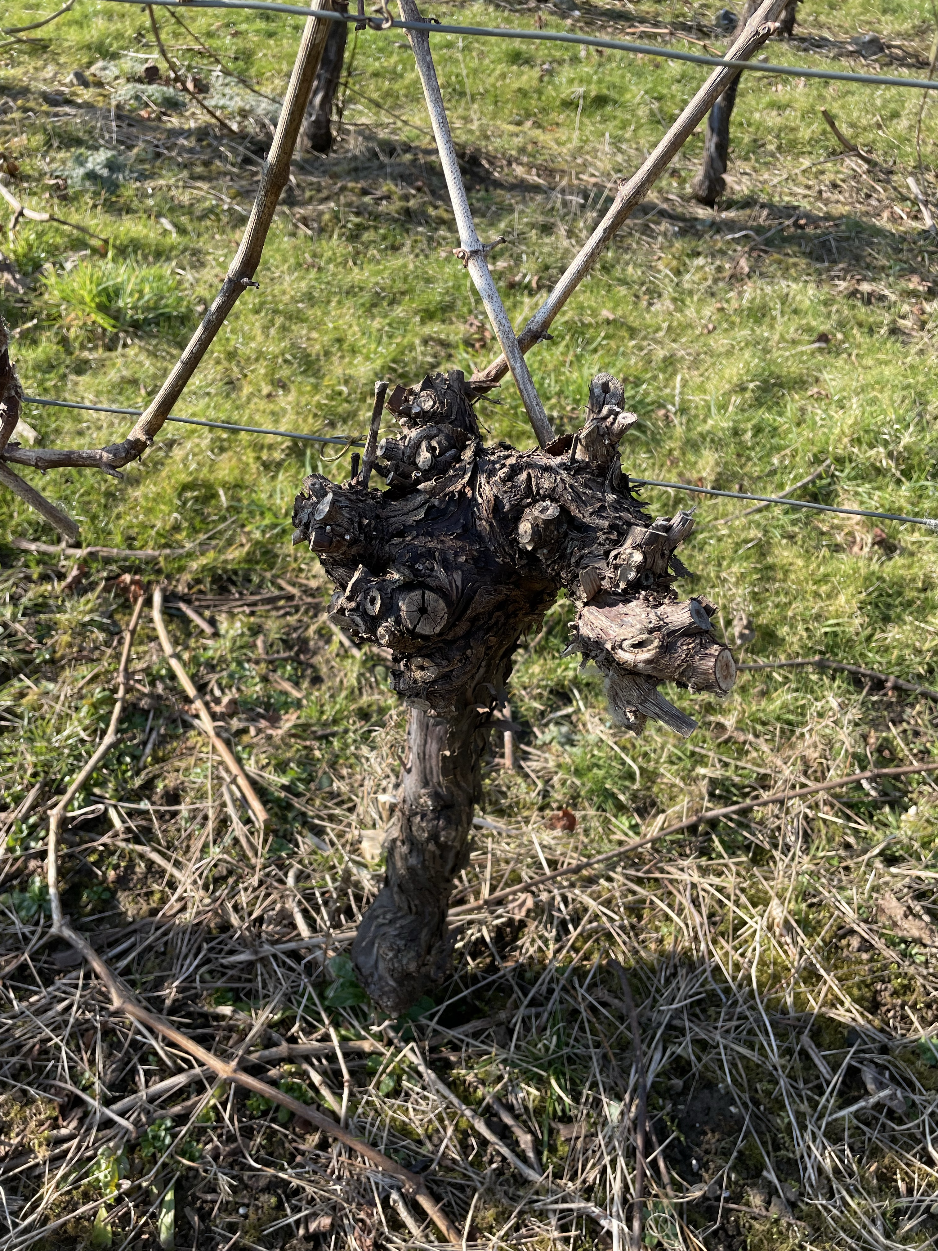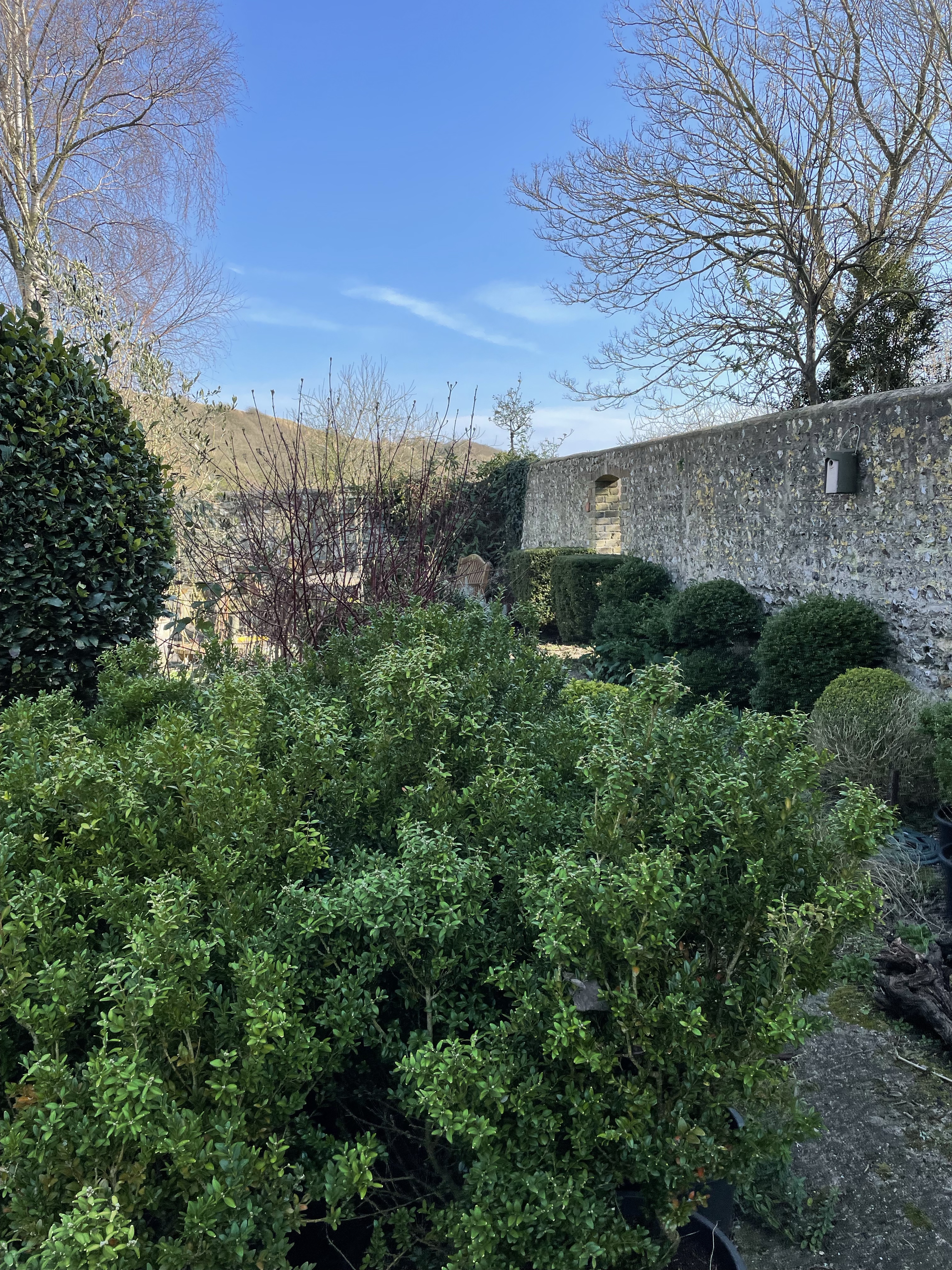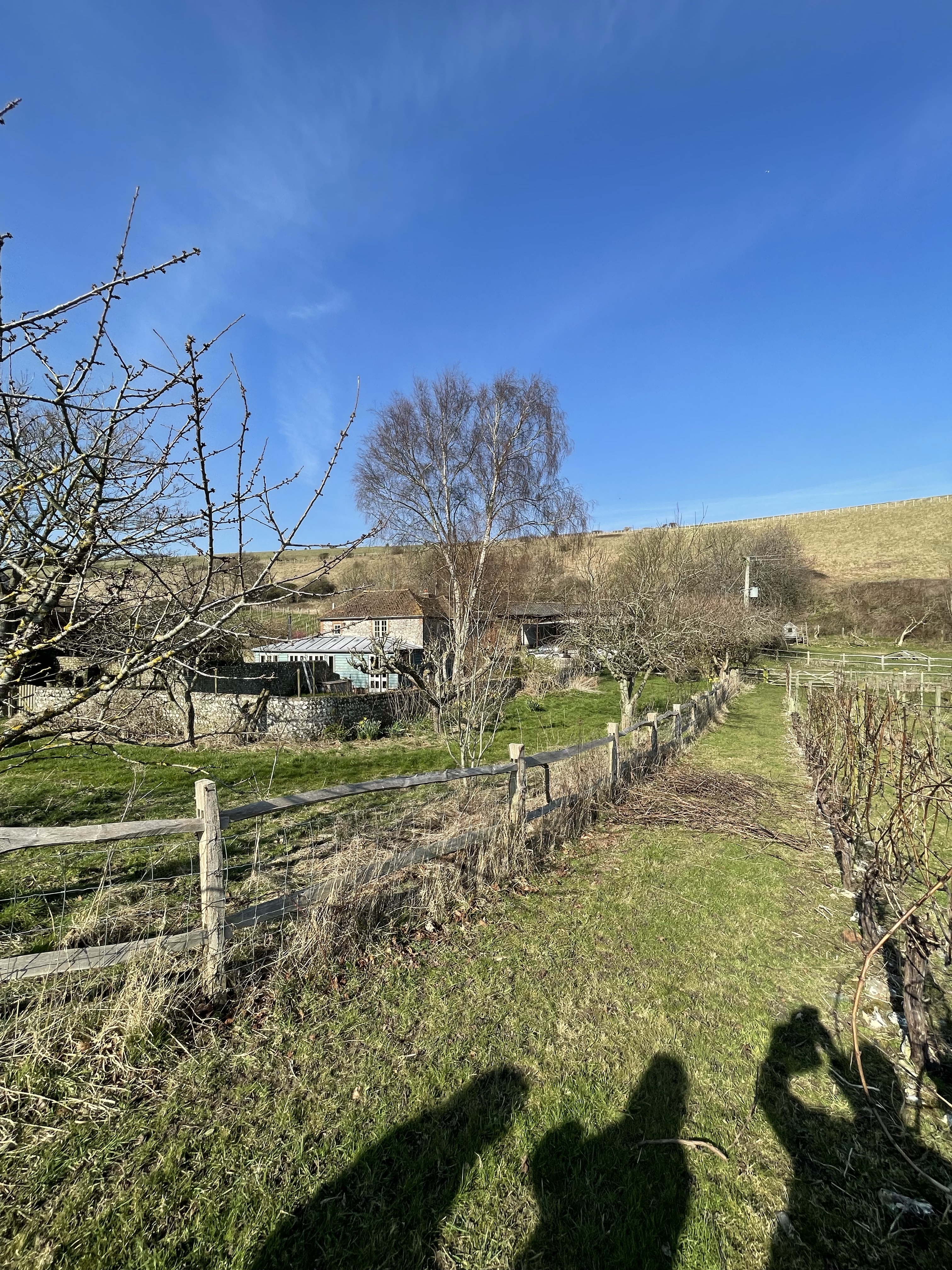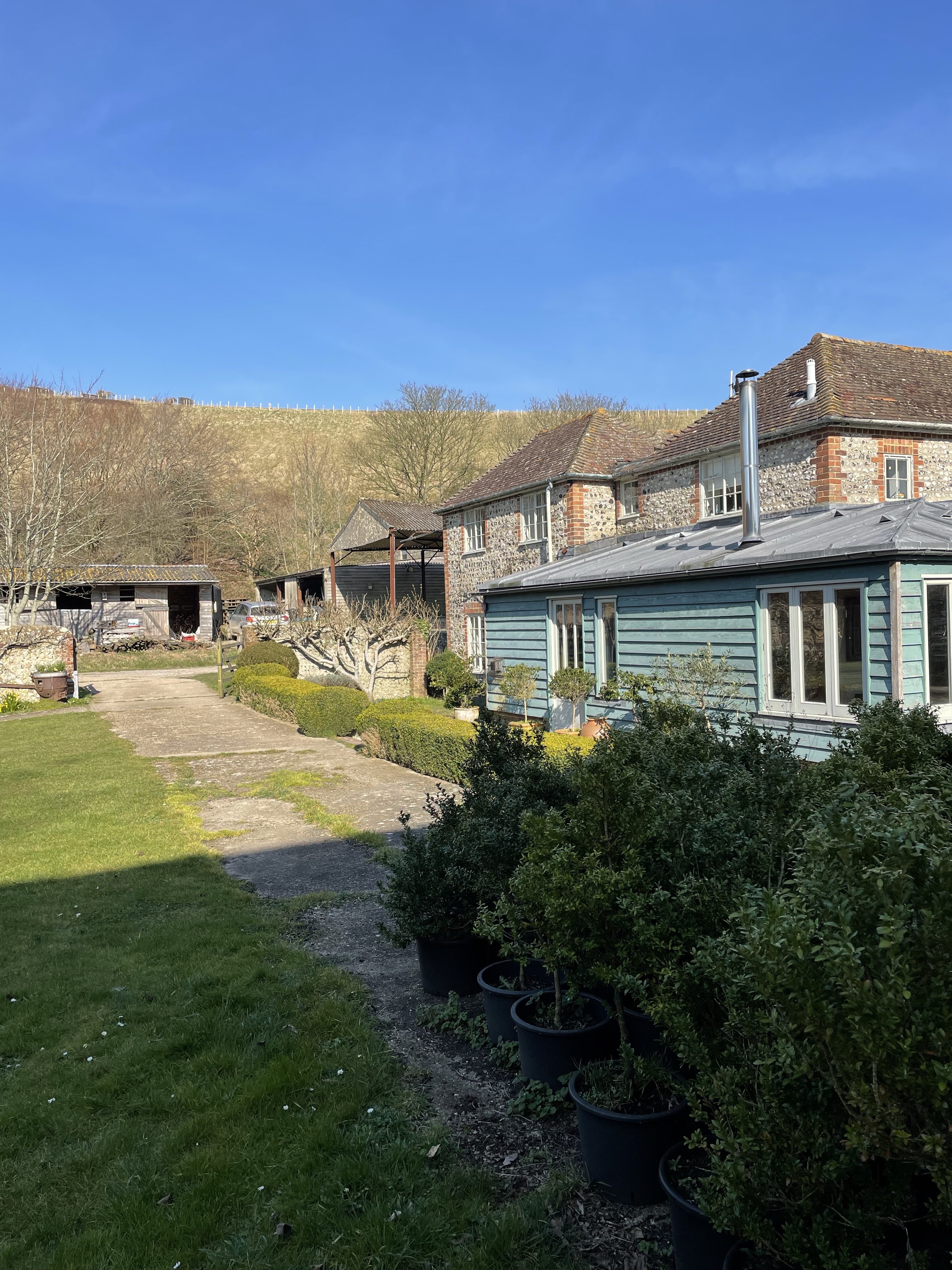 The soil is classic Downland chalk strewn with flints. One slope in the hollow faces vaguely north, the other vaguely south. Counter-intuitively, the north-facing slope often ripens first, largely because of a protective virtual cliff opposite, which carries the public footpath from the South Downs Way. The hollow generally protects the site from the winds which have ravaged Rathfinny along the coast, forcing them to erect an impressive array of windbreaks.