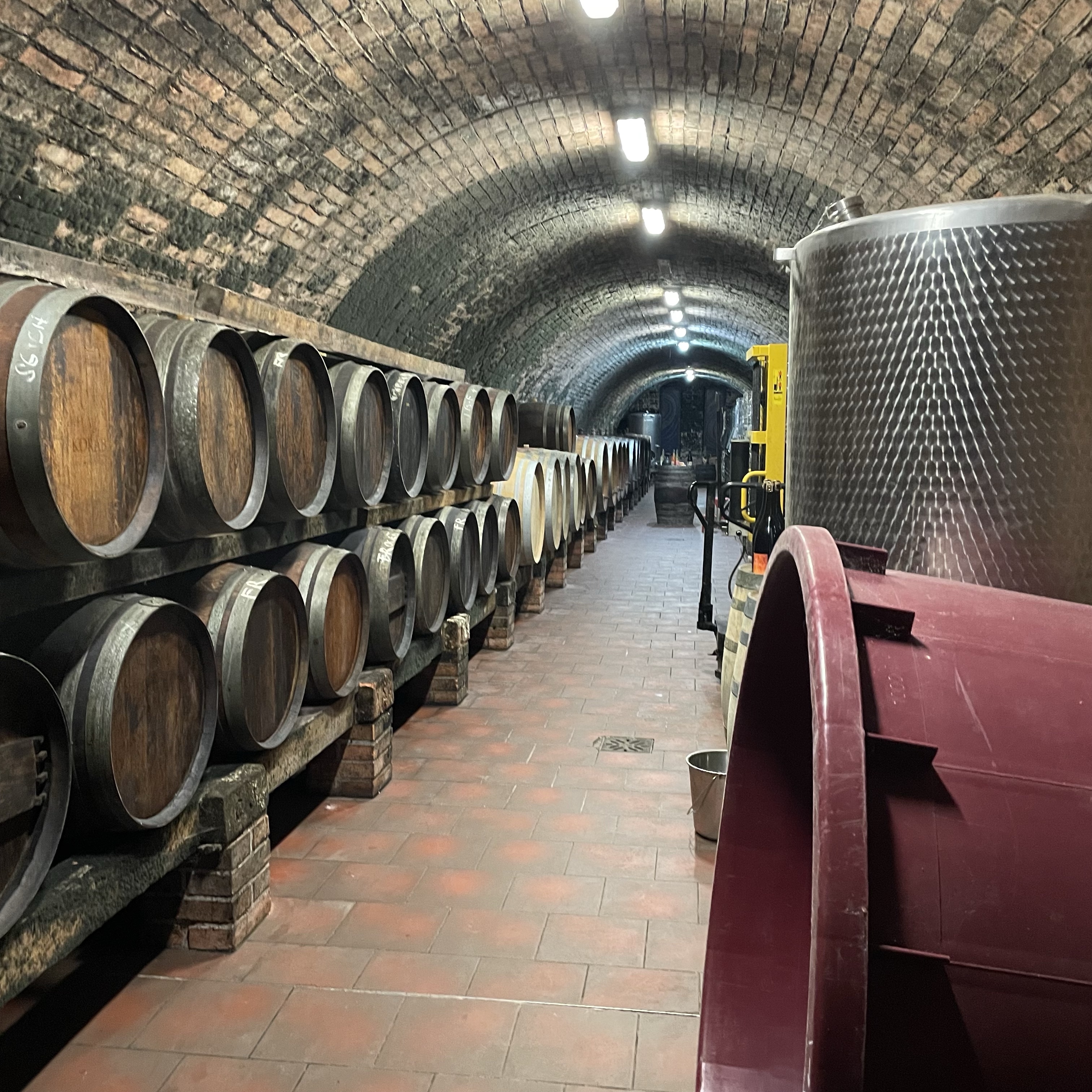 After a spectacular dinner of several thoughtfully prepared dishes, each accompanied by a different wine, we entered the small chalet that forms the entrance to the cellar. Your eyes are deceived because behind a big red door stretches a long tunnelled underground cellar on two levels, excavated into the sandstone hillside. After the heat outdoors the temperature in here is as cool as can be. In fact, after an hour in here a few people wished they’d brought a jacket.