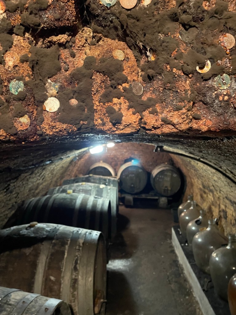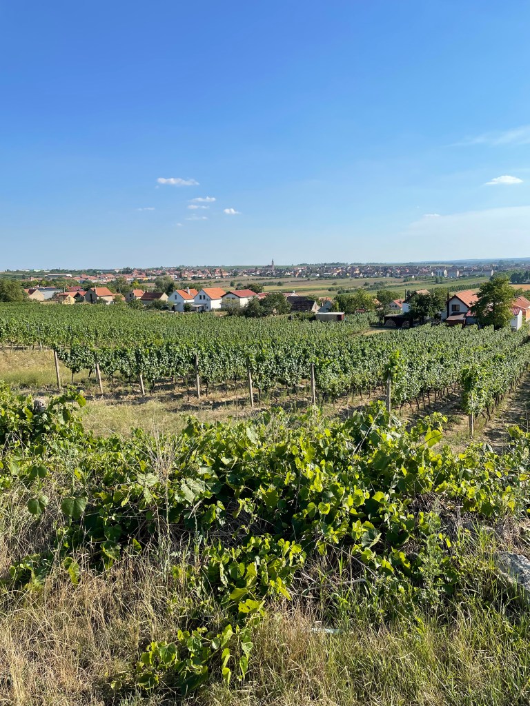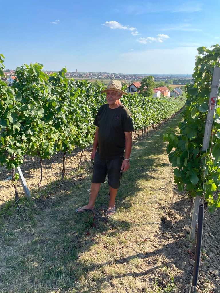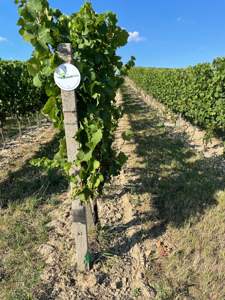 We began the tasting in the upstairs barrel room, quite small. Then we moved down to the underground cellars. We finished, despite the mid-thirty-degree heat, out in the vines. Moravia’s vineyards are attractive anyway, the rural nature of Moravia more beautiful than I had imagined. But visiting a much-loved natural environment like this, with everything in balance was quite magical. It could hardly fail to make me appreciate the wines even more than I did…and to have an even more emotional response when I drink them.
