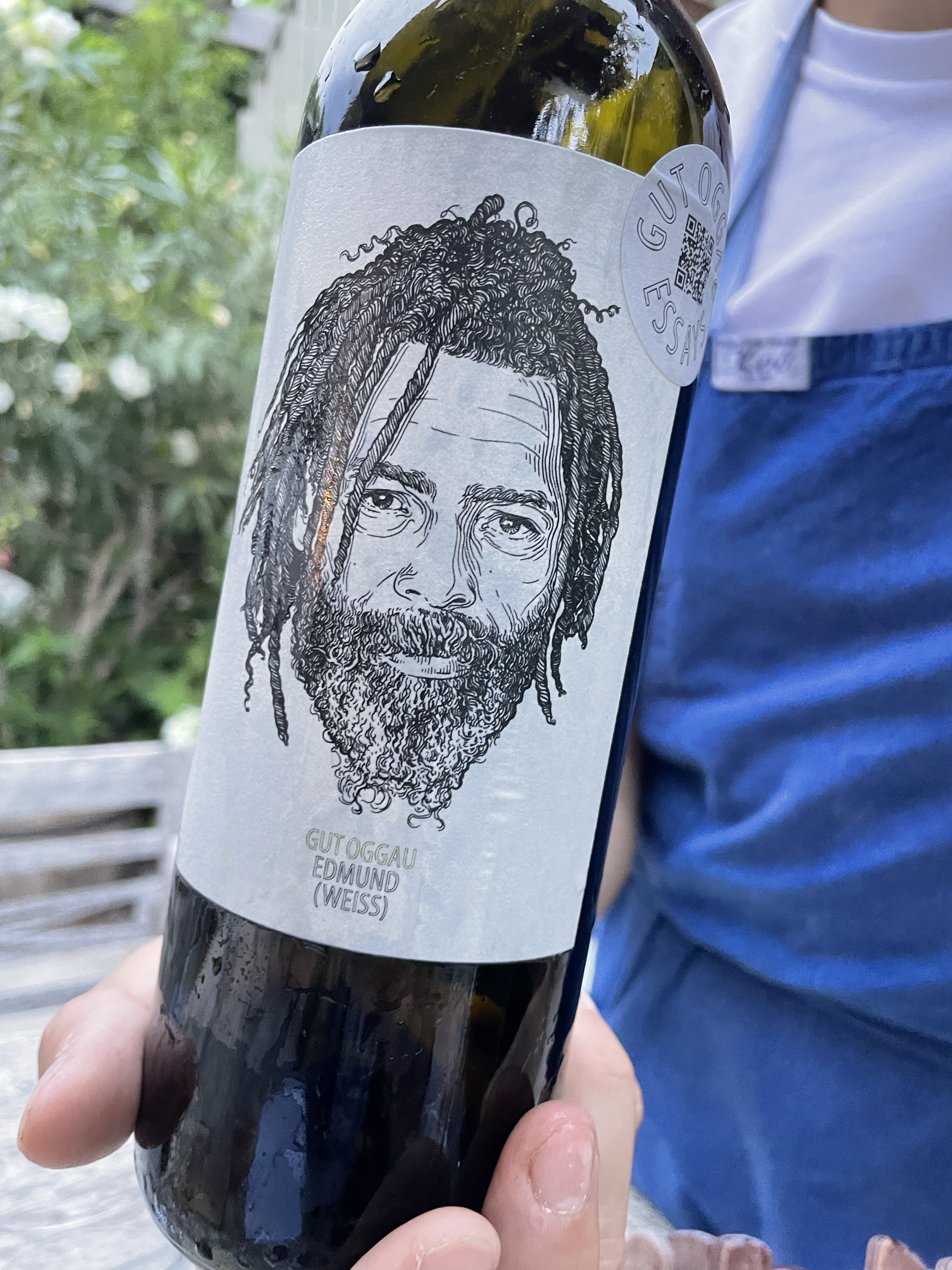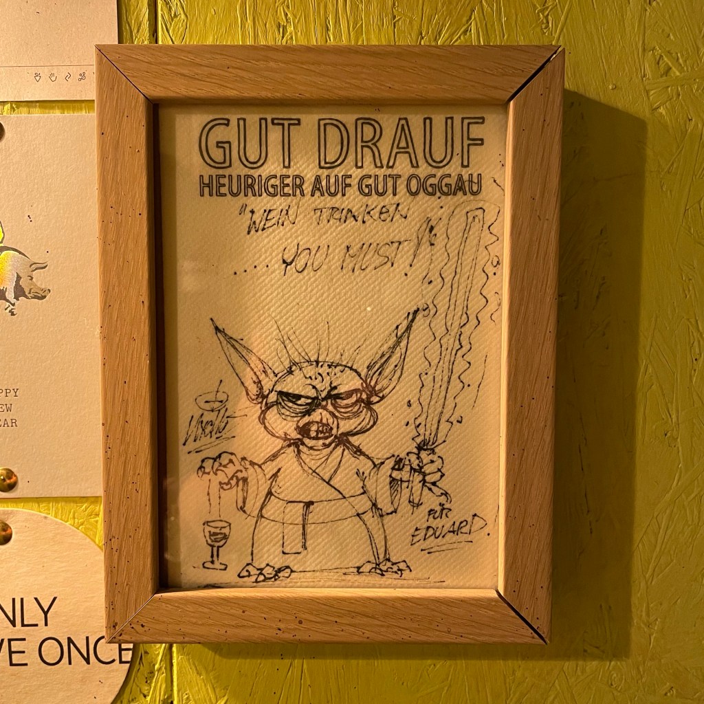 We were invited to dine at Gut Oggau’s Inn and then to spend some time with Eduard touring the winery and visiting the horses. We had a spectacular meal of small plates, created from ingredients grown and tended by the team. Everyone pitches in for service, and on what seemed like an incredibly busy Sunday evening everyone was very attentive. With the dishes we got through ten wines (and could still stand afterwards) which I shall briefly describe. I shall presume that readers are aware of the “family” created for their wines, made up of three generations. The Maskerade wines below are bottled in litres, and wear a mask. They are vineyards under biodynamic conversion, which have not yet revealed their full personalities.