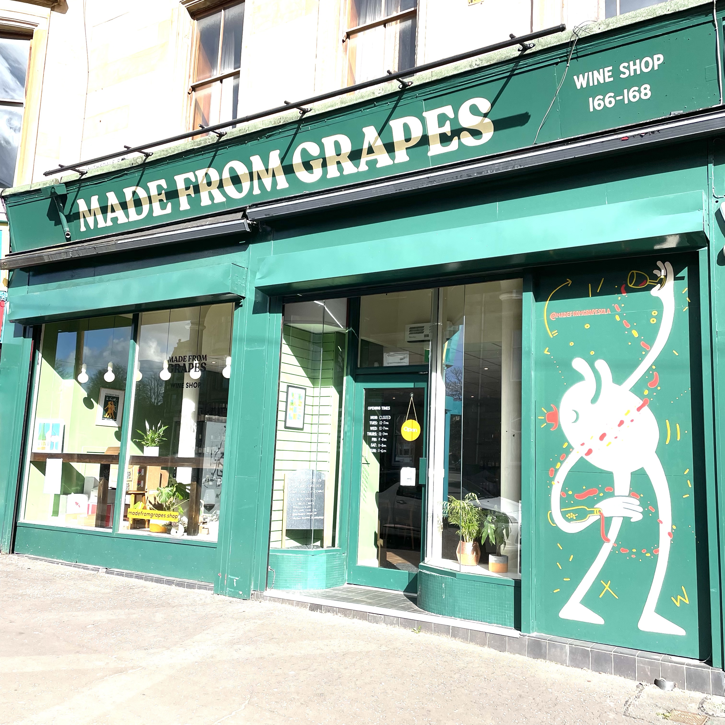Made From Grapes is situated in Glasgow’s South Side, on Nithsdale Road. For someone not knowing the city, and who decided to walk from the centre (about 45 minutes), the journey was an interesting one. Half an hour after crossing the Clyde I had traversed a wilderness of shuttered shops, social housing, and derelict industrial buildings, save for a few interesting restaurants (I spotted Afghan, Persian and “Middle Eastern”) and global food stores. I probably saw half-a-dozen people on the street. Passing under a flyover for the M8 Motorway I eventually reached Nithsdale Road, and found myself in a very affluent area, akin to West London’s smarter neighbourhoods, with cafés spilling onto the street, delis and Made From Grapes. The contrast made me blink.