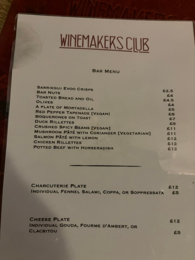 Winemakers Club is many things. They put on tastings for the trade, hold events for the public and are a wine bar offering a selection of tasty small plates such as cheese and salami, pâté, rillettes, and, since my last visit, a couple of vegan options. They are a wine shop, and they also import themselves, and it was a couple of those wines we drank on Monday.