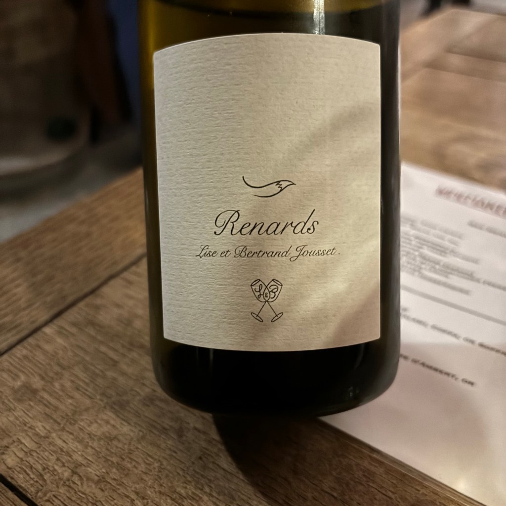 Lise and Bertrand Jousset farm around eleven hectares at Montlouis on the Loire. The wine we drank was a Chenin Blanc from a single site of seven hectares, Clos aux Renards. The vines grow on interesting blue clay infused with silex (flint). It has been described by some as one of the greatest Chenin Blanc vineyards in France. I was recommended this by an acquaintance only a day before and it was a brilliant shout. We have old vines (c80yo) grown and vinified as a natural wine with just minimum added sulphur. Natural winemaking here includes no mechanisation either, just horse power and human hands.