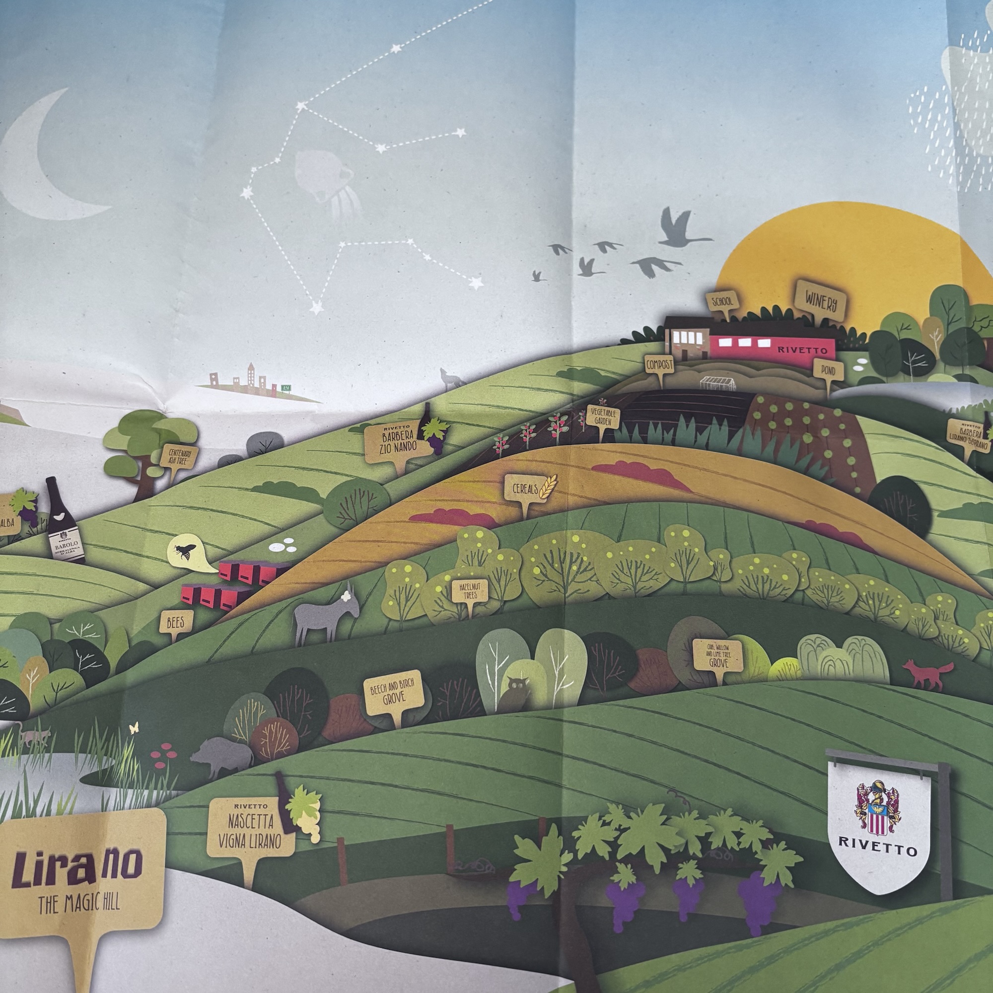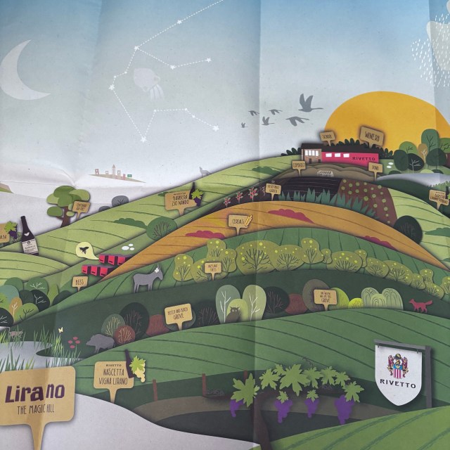 I could easily write a page on the Rivetto philosophy, but perhaps the illustration below gives an idea of the regenerative methods employed on the beautiful Lirano Hill (Vigna Lirano), a ridge between Serralunga d’Alba and Sinio, or between Alta Langhe and the Barolo Hills. Enrico calls it a magnetic hill, a complex ecosystem which he farms biodynamically (possibly the only certified biodynamic producer in the Langhe?). Two wines from Vigna Lirano were on show and poured by Ed of Astral Wines in Enrico’s absence.