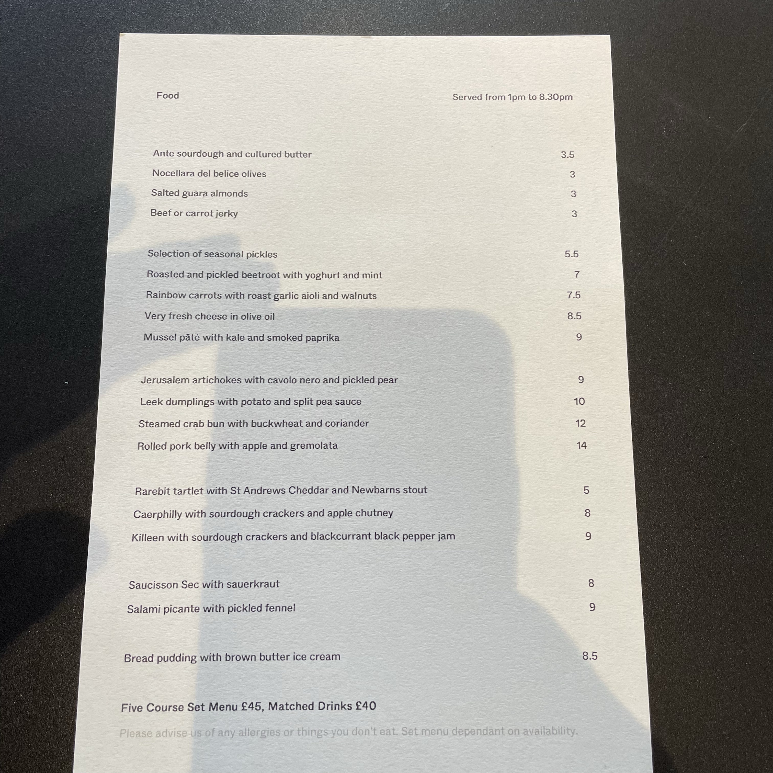 On a Tuesday lunchtime it was very easy to get a table, being there at 1.00pm sharp. I think you’d be lucky to get in without a booking in the evening, but there are chairs at the bar for walk-ins, either for a glass or two, or food. In addition to the à la carte, a five-course set menu is offered for £45 with the option of wine pairings. This can be willingly tailored to dietary requirements, including fully vegan, with notice when booking.